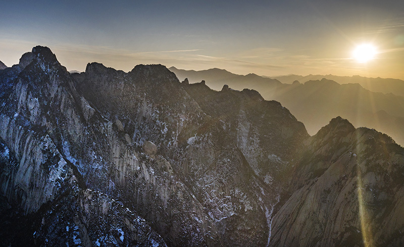 夕阳下的西岳华山(12月4日无人机拍摄)。