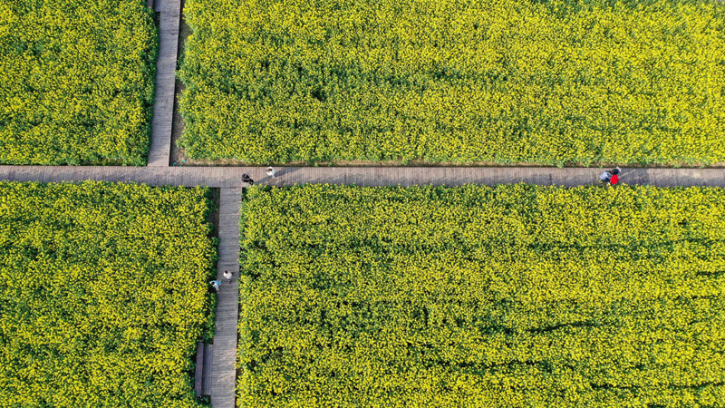 3月14日,游人在南京市江宁区谷里街道徐家院村油菜花田放松身心(无人机照片)。
