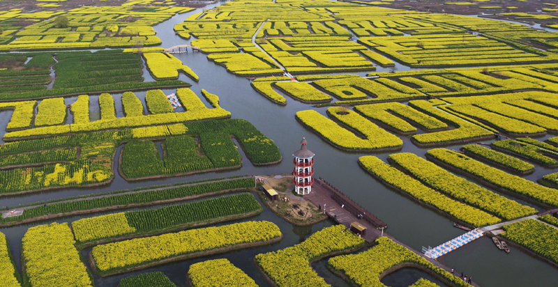 近日,正值江苏省兴化市千垛景区万亩油菜花盛开期,金灿灿的油菜花在水道围成的垛田上形成一片片金黄色的“花海”,形成了“河有万湾多碧水,田无一垛不黄花”的壮观景色。