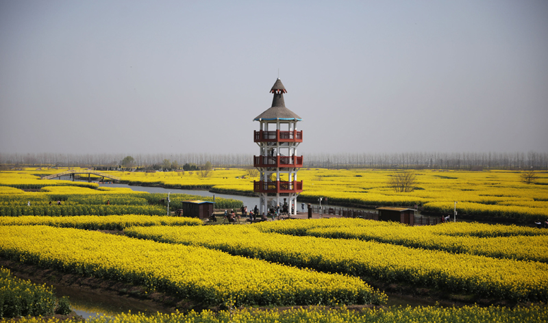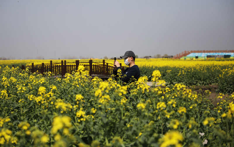 3月18日,游客在江苏省兴化市千垛景区拍照。