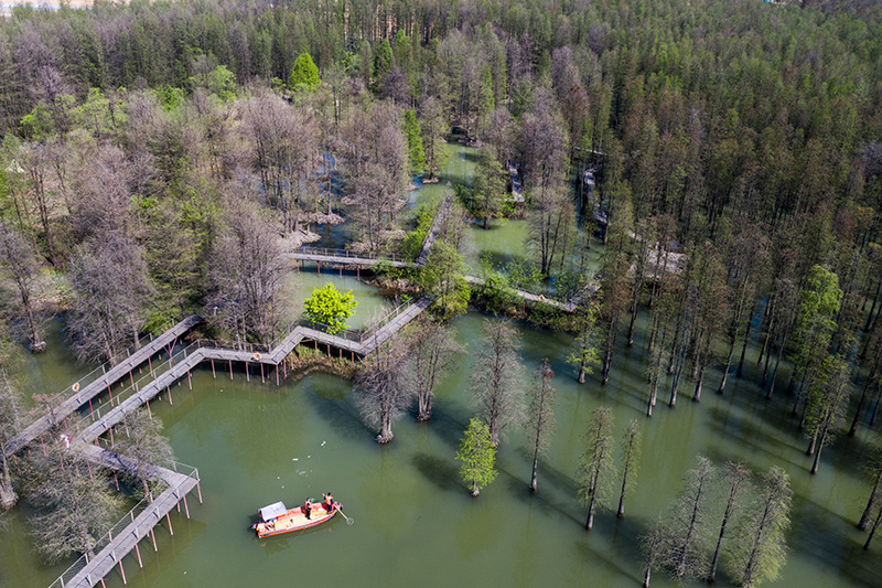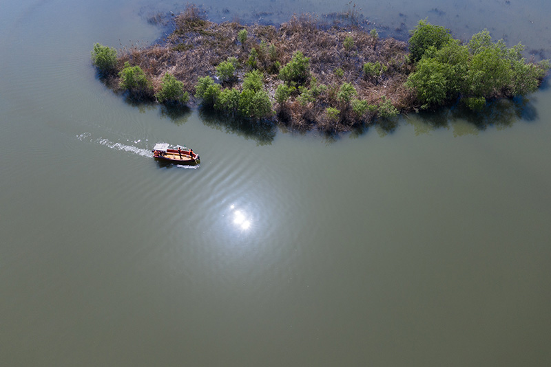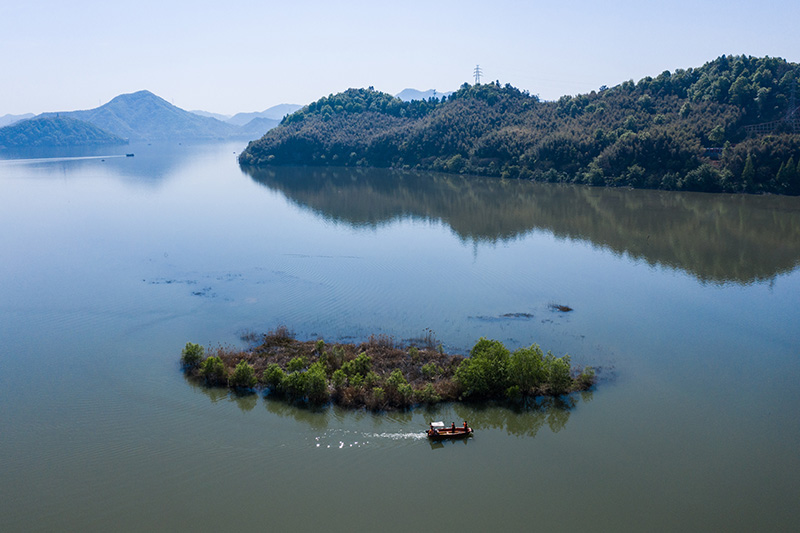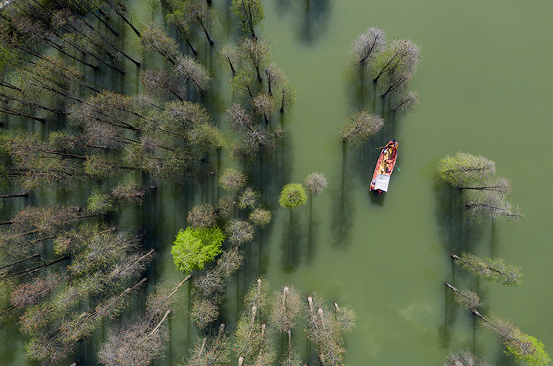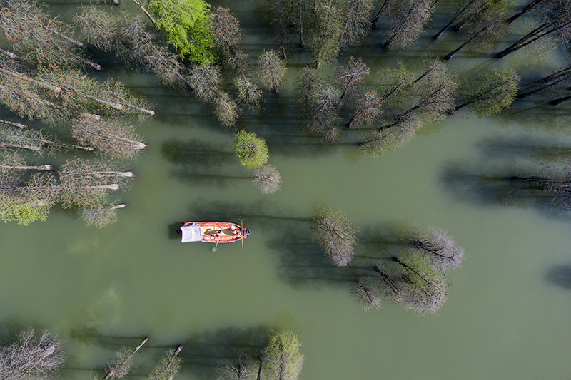 2020年4月8日,保洁工作人员乘船清理青山湖水上森林区域湖面的漂浮物(无人机照片)。保洁人员每天都要乘船巡湖,保障湖区环境卫生。
