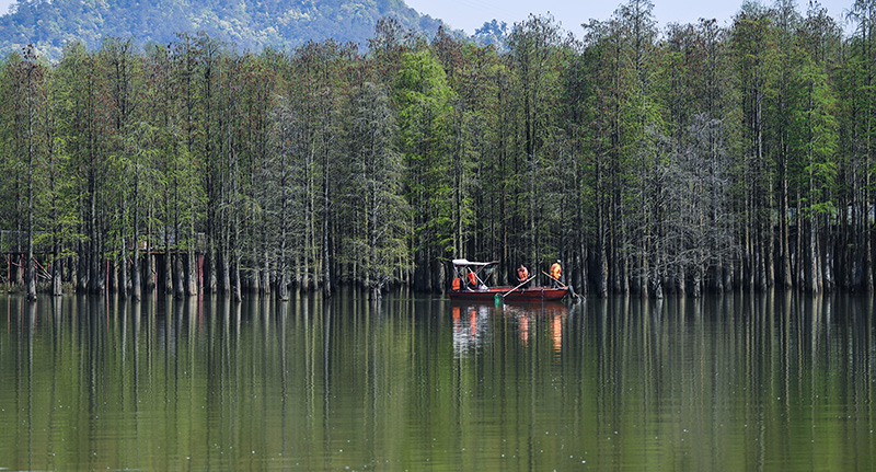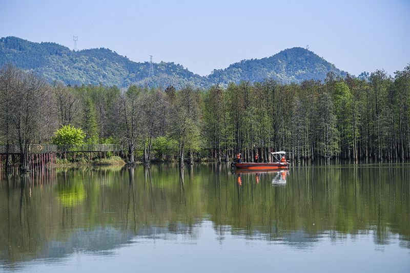 2020年4月8日,保洁工作人员乘船清理青山湖水上森林区域湖面的漂浮物。保洁人员每天都要乘船巡湖,保障湖区环境卫生。