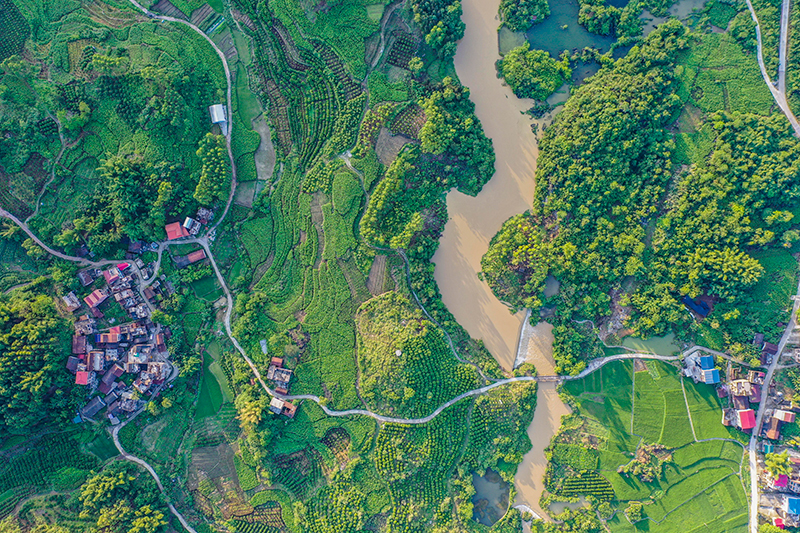 这是广西环江毛南族自治县大才乡重楼村夏日田园景色(5月25日摄,无人机照片)。