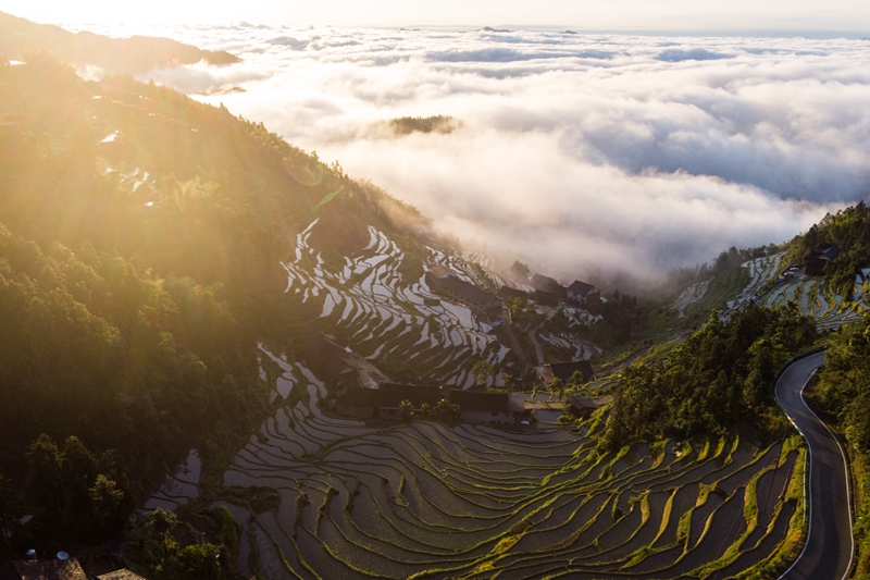 近日,湖南省娄底市新化县水车镇的紫鹊界梯田在雨后云雾缭绕、美如画卷。