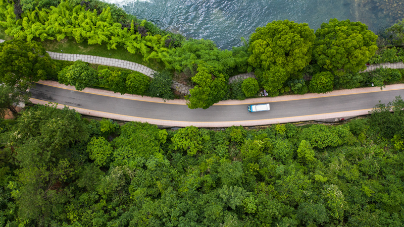 6月2日,车辆在阿哈湖国家湿地公园内行驶(无人机照片)。