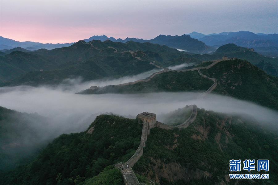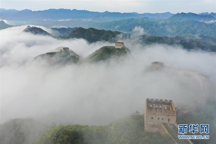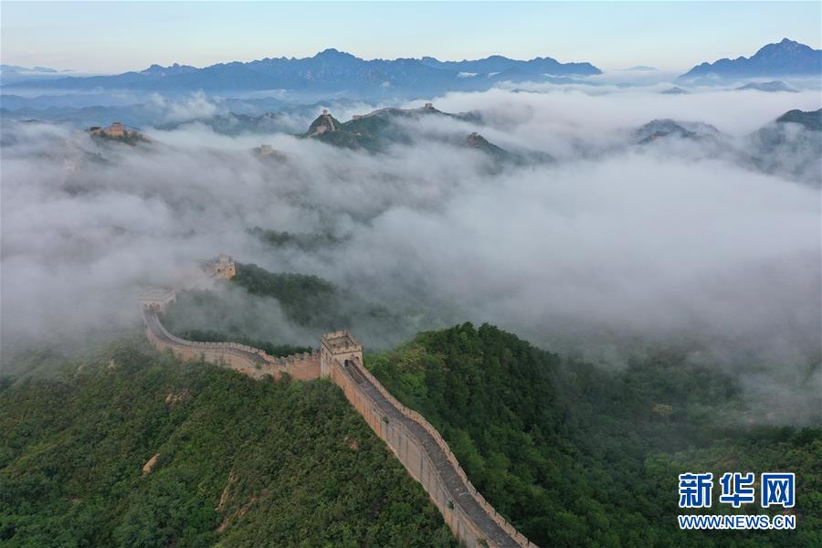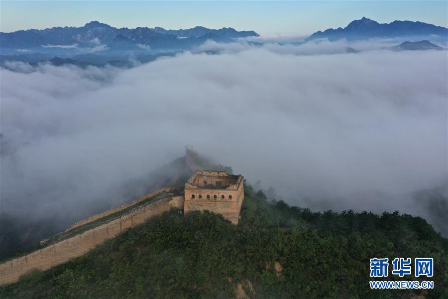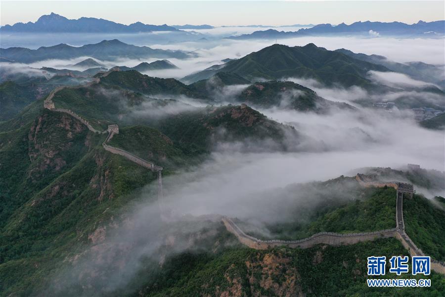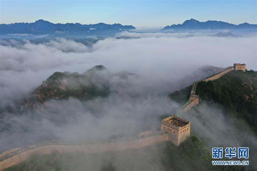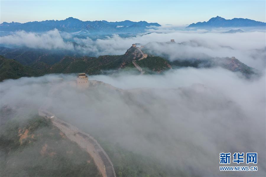 8月10日清晨拍摄的金山岭长城云雾景观(无人机照片)。 当日清晨,位于河北省承德市滦平县的金山岭长城云雾翻滚,壮美如画。 新华社发(周万平 摄)
