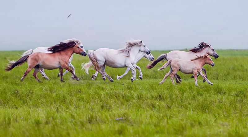 7月12日,马群在锡林郭勒大草原上奔跑。