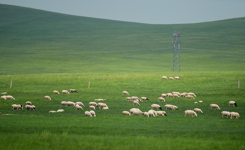 7月12日,羊群在锡林郭勒大草原上觅食。