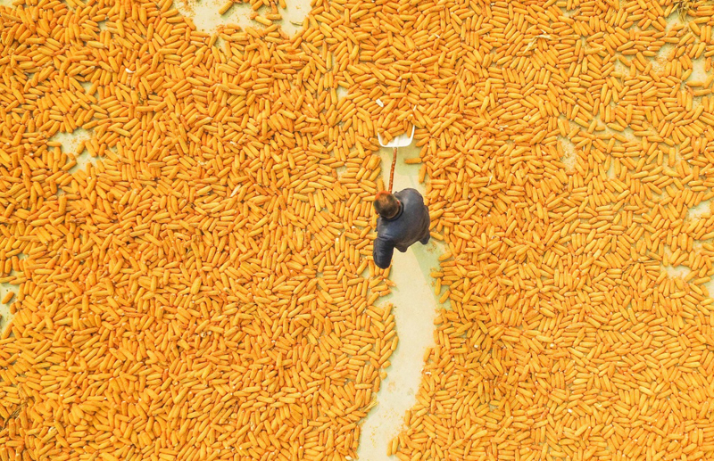 10月18日,河北省唐山遵化市的农民在院内晾晒玉米(无人机拍摄)。