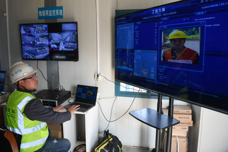 3月26日,工作人员在“浙江智慧之门”项目工地察看“工地大脑”的实时数据。据了解,“工地大脑”汇总了人员、设备、物料、进度、环境等要素。