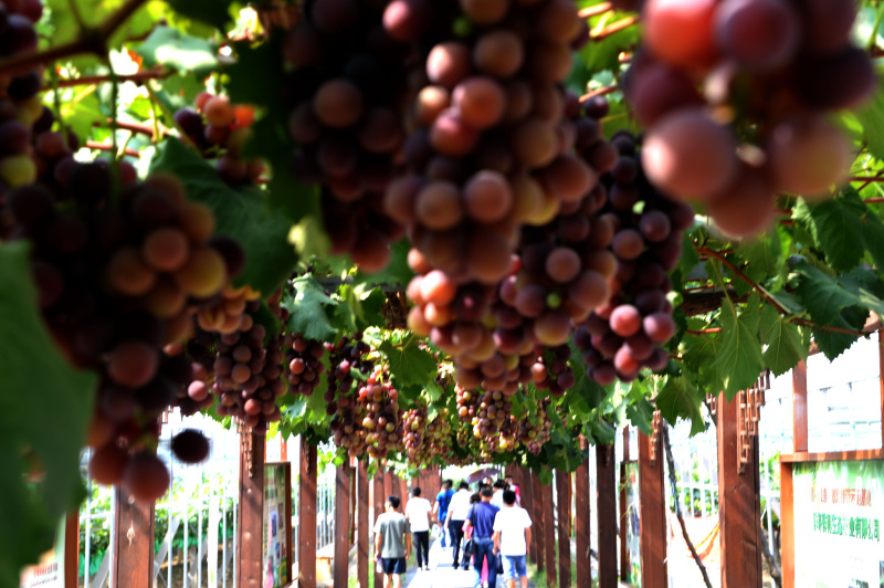 8月2日,游客走在大圩镇“鲜来鲜得”葡萄园的葡萄走廊下。