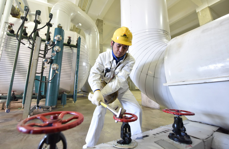12月3日,工作人员在国华定州电厂调试机组供热管网。