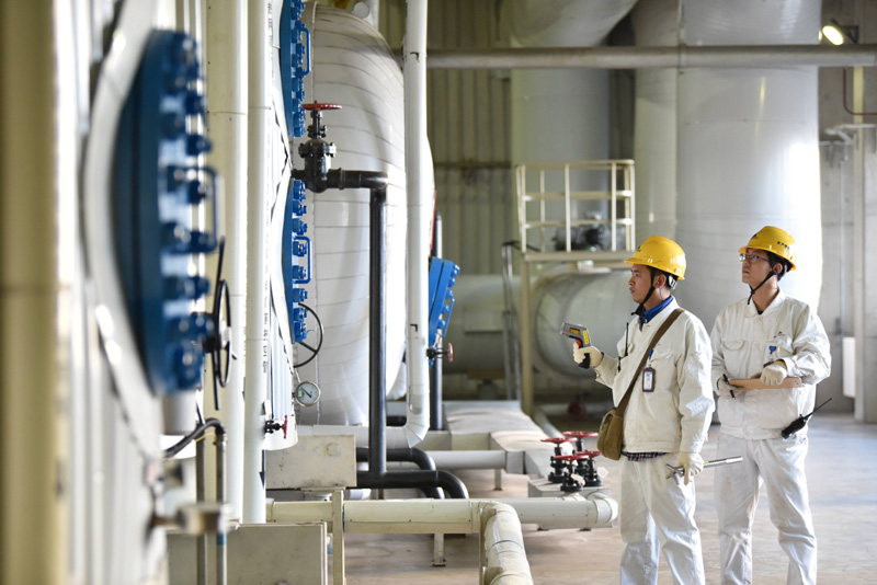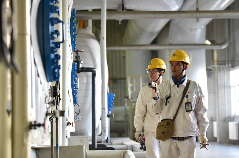 12月3日,工作人员在国华定州电厂巡检机组供热设备运行情况。