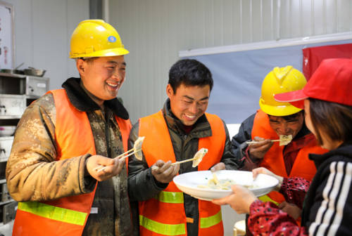 12月21日,农民工在安九铁路安徽段项目工地上品尝刚出锅的饺子。