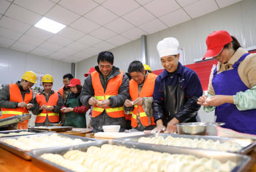 当日,在安九铁路安徽段项目工地上,农民工和志愿者一起包饺子、迎冬至,感受冬日别样的温暖。