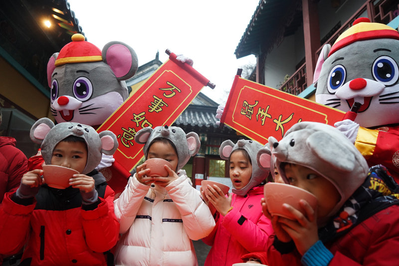 1月2日,小朋友在南京玄奘寺的赠粥送祝福活动现场喝腊八粥。