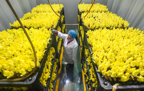 1月9日,河北霸州一家农业科技公司工作人员在查看菊苣生长情况。