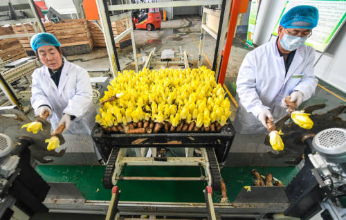 1月9日,河北霸州一家农业科技公司工作人员在切割菊苣。