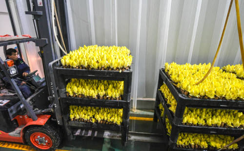 1月9日,河北霸州一家农业科技公司工作人员用机械搬运菊苣。