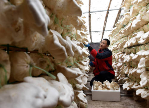 1月14日,任县马庄村农民在设施温棚内采摘白灵菇。