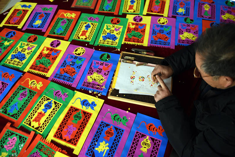 1月16日,山东省临沂市郯城县马头镇万高册村村民在制作门笺。