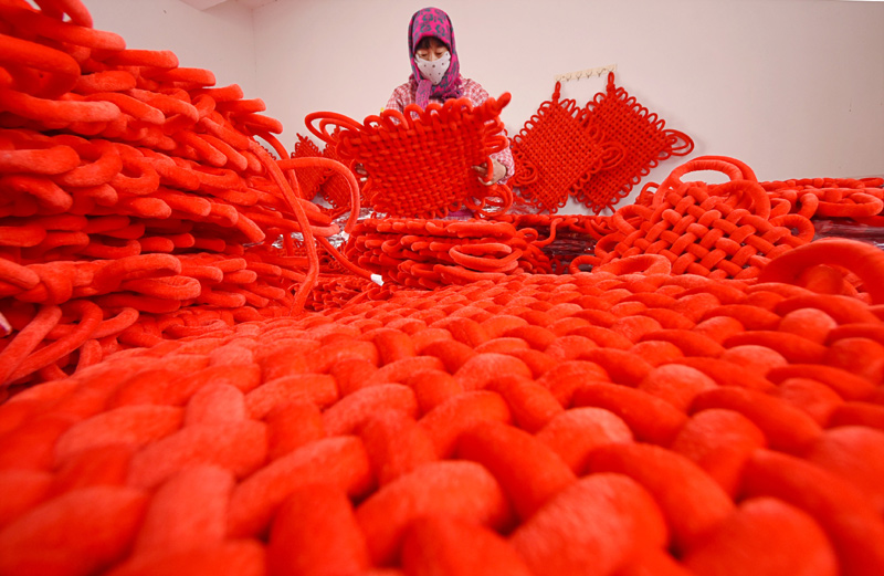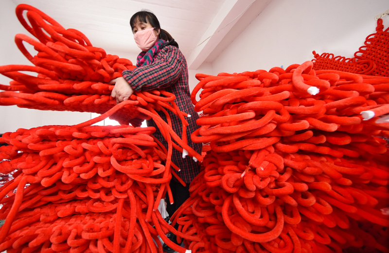 春节临近,山东省沂源县的中国结等节庆饰品迎来加工、销售旺季,工人们加紧生产满足节日市场供应。