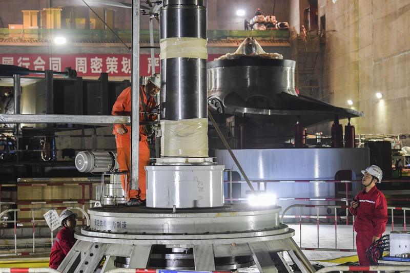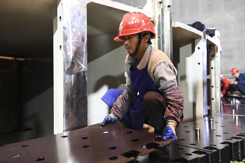 大藤峡水利枢纽工程的工人在安装发电机组零部件(1月17日摄)。