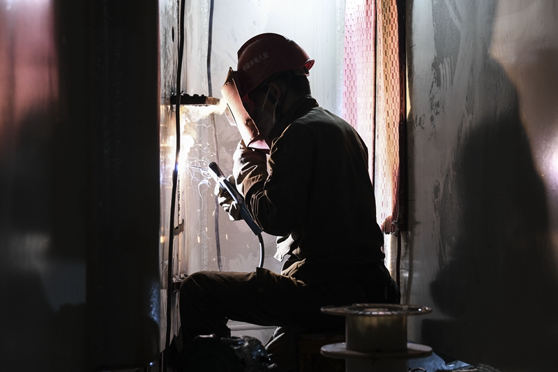 大藤峡水利枢纽工程的工人在焊接钢板(1月17日摄)。