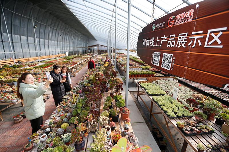 1月19日,市民在山东青岛市即墨区百亿绿洲农业科技种植基地大棚内通过扫描二维码选购花卉。
