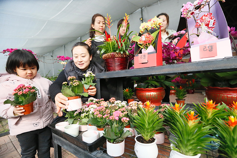 1月19日,市民在山东青岛市即墨区百亿绿洲农业科技种植基地大棚内选购花卉。