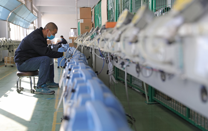 2月5日,沈阳新松医疗科技股份有限公司员工在车间生产呼吸机。