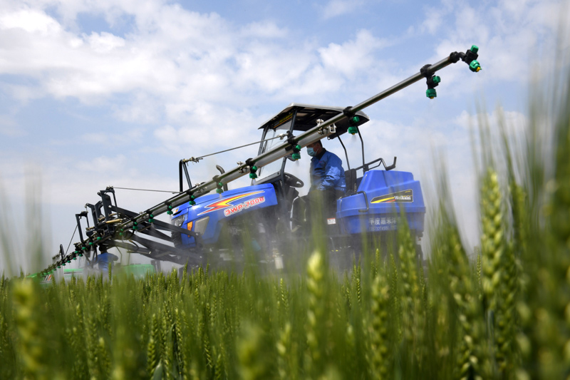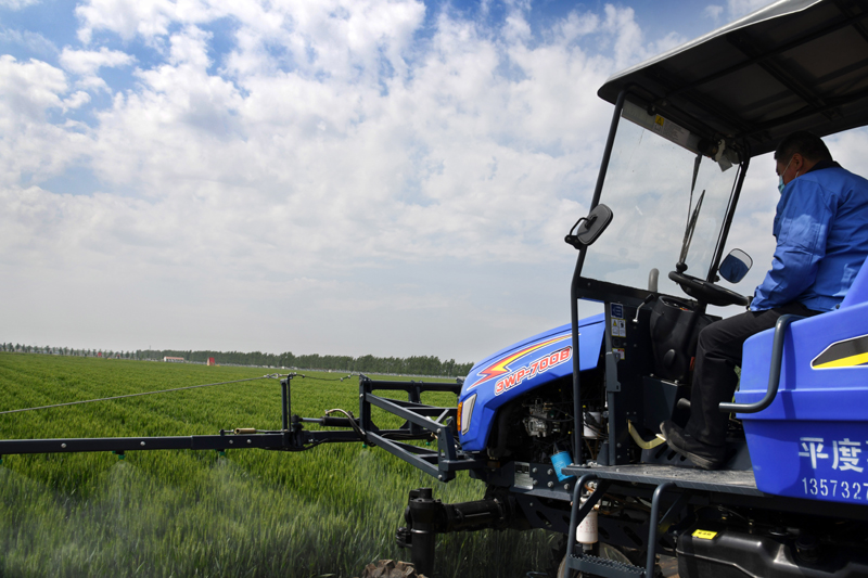 5月7日,在山东青岛平度市蓼兰镇胜利村,喷杆喷雾机在进行小麦条锈病防治喷洒作业。