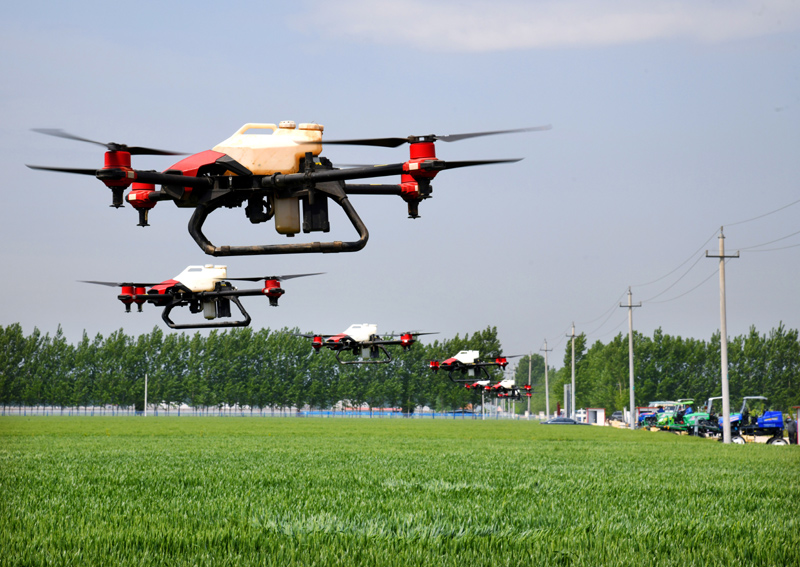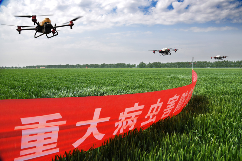 5月7日,在山东青岛平度市蓼兰镇胜利村,植保无人机在进行小麦条锈病防治喷洒作业。