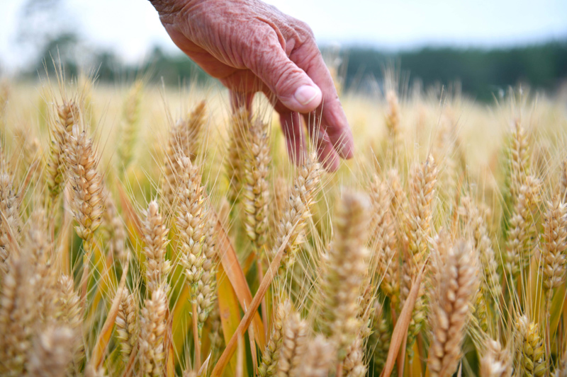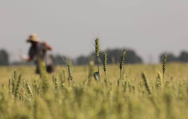 5月20日,在安徽省亳州市谯城区洪庄村的麦田里,村民在查看小麦的生长情况。