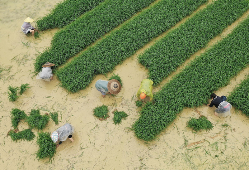 5月20日,河南省武陟县大虹桥乡西小虹村农民在麦田里忙碌。