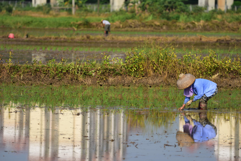 5月20日,海南省琼海市嘉积镇桥头村的农民在田间插秧。