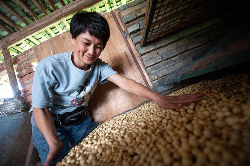 8月3日,在福建南平后畲村,农户用传统工艺烘烤莲子。