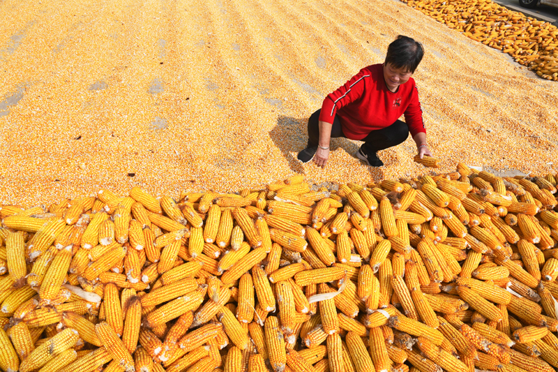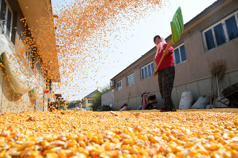 10月19日,青岛莱西市夏格庄镇官庄村村民在屋前空地上晾晒玉米。