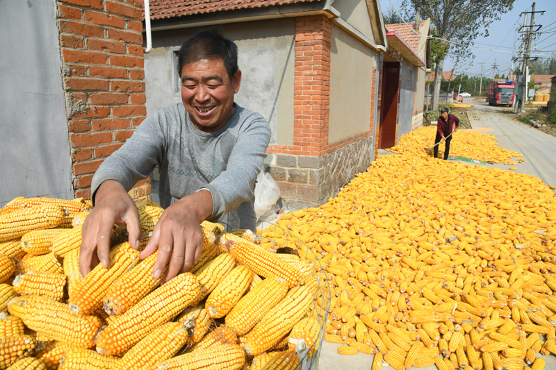 10月19日,青岛莱西市夏格庄镇官庄村村民褚言说,今年玉米颗粒饱满能卖个好价钱。