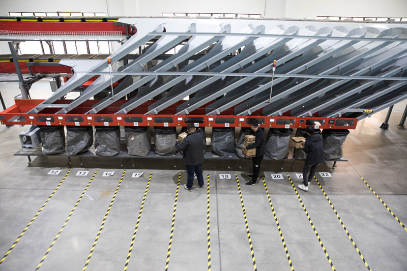 11月18日,工作人员在一家物流公司无锡分拨中心,利用交叉带自动分拣系统分拣包裹。