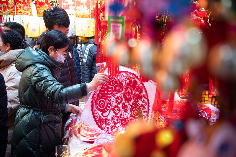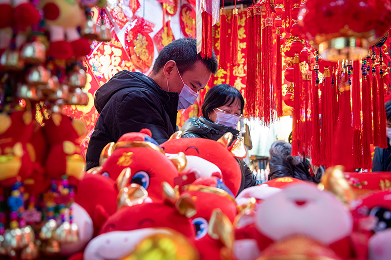 1月31日,市民在太原市迎泽区双塔寺街的一家市场内选购新春饰品。