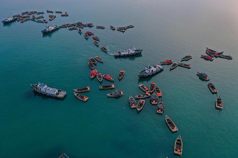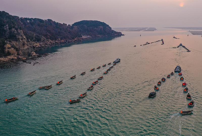 3月9日,在山东荣成俚岛湾畔,渔民们驾船在码头集结,准备前往藻类养殖区进行作业(无人机照片)。