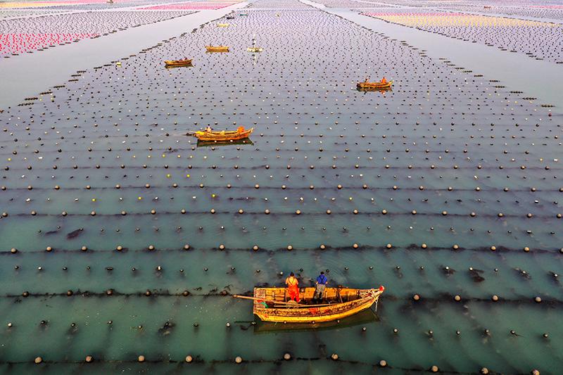 目前正值山东荣成各大海洋牧场藻类、贝类养殖的管护期,渔民们驾船在海面上穿梭作业,呈现出一派“海上春耕”的繁忙景象。