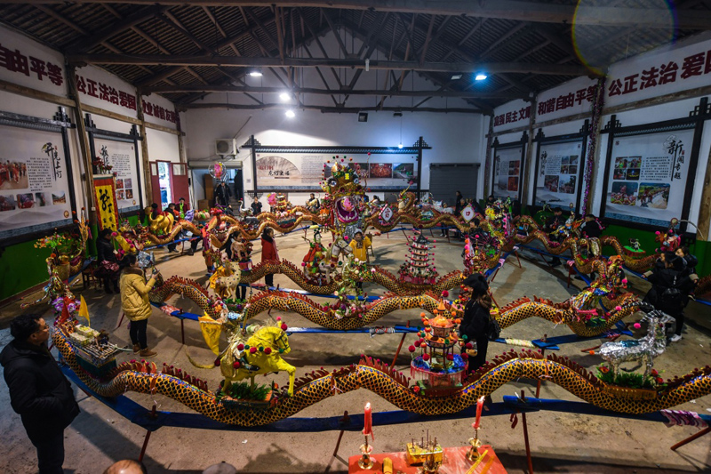 2月17日,村民们在村文化礼堂中观看展示中的窈口板龙。