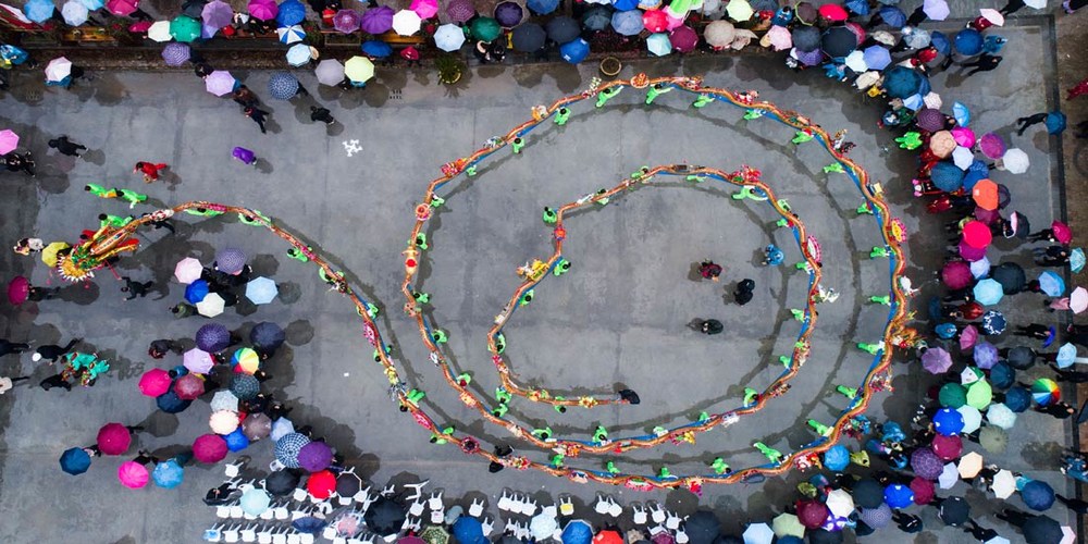 2月17日,乡村女子舞龙队队员抬着特色的板龙在窈口村的广场上进行表演(无人机拍摄)。
