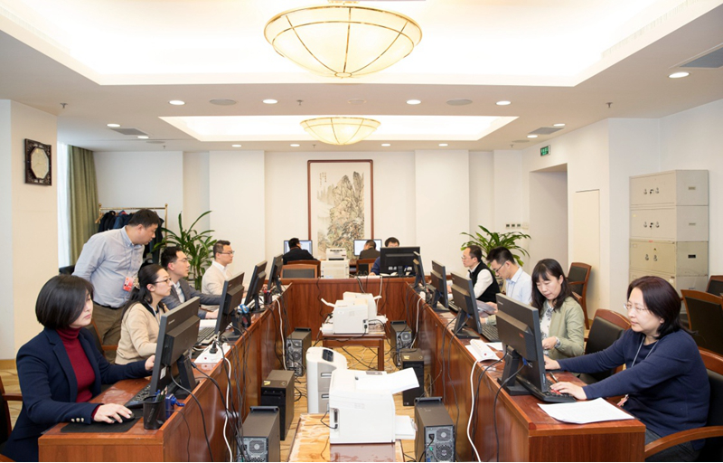 3月12日,十三届全国人大二次会议秘书处工作人员在认真工作。