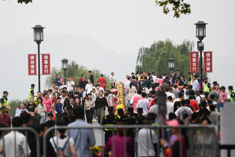 10月7日,杭州西湖风景区的断桥上游人络绎不绝。