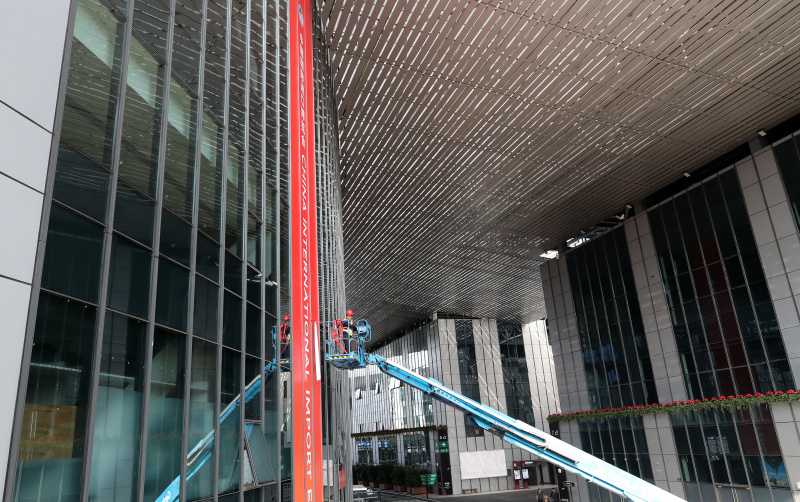 10月21日,工人乘云梯车在国家会展中心(上海)张贴进博会装饰。