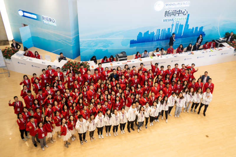11月4日,第二届进博会部分志愿者在国家会展中心(上海)的新闻中心合影留念。