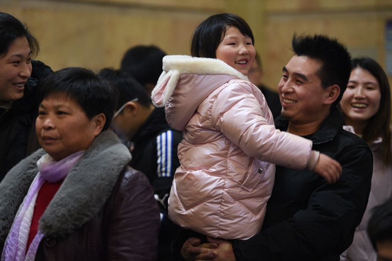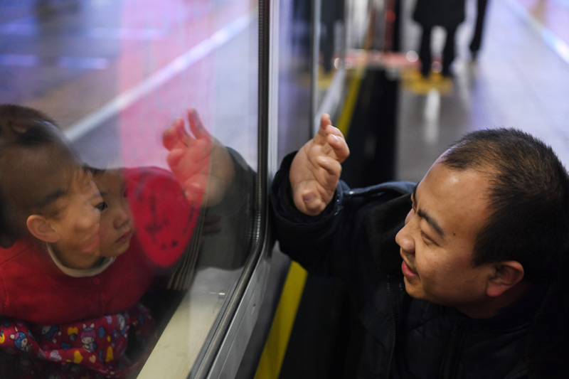 1月10日,在北京火车站K4051次列车前,送别家人的王长付(右)向车内的3岁女儿招手。